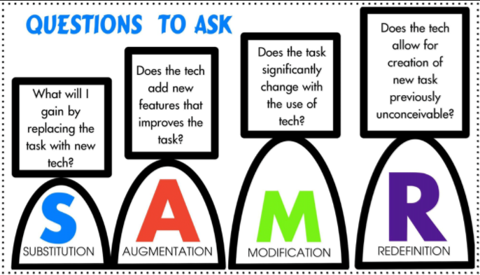 Most classrooms in North America utilize technology at the substitution and augmentation level, where they have introduced tablets and smart boards into the teaching tool box. Many teachers have also found inventive ways to utilize technology at the level of modification and redefinition.